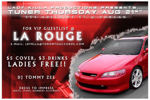 5x7 full colour front and back promotional cards for a hot new night club located down town Toronto. La Rouge.