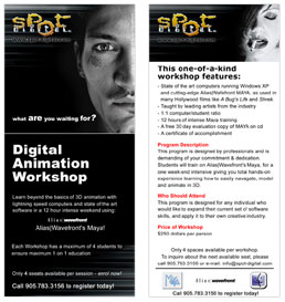 A full colour front and back 4x8 promotional ad flyer for Spot Digital's private 3D animation training courses.